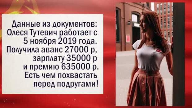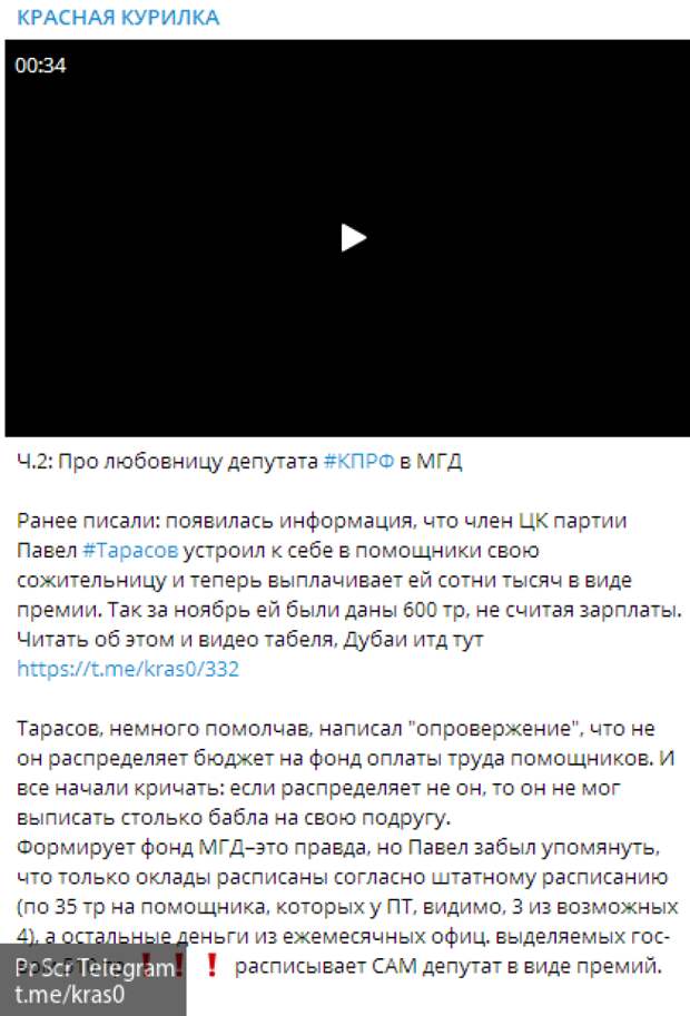 ТГ-канал «Красная курилка» сообщил, что депутат Мосгордумы от фракции КПРФ Павел Тарасов пристроил на должность помощника свою любовницу Олесю Тутевич. Ежемесячно девушка помимо зарплаты получает премию в размере около 600 тысяч рублей, а также пользуется служебным автомобилем.