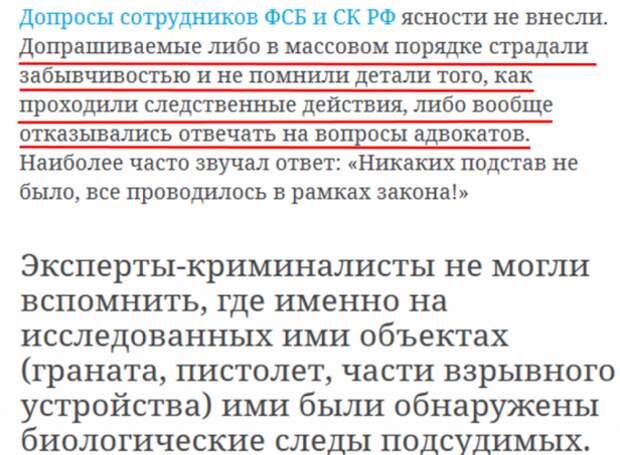 Разумеется, это ложь. Все претензии обвиняемых были отвернуты соответствующими органами. При этом, защищая террористов, «Новая газета» забывает упомянуть, что они готовили теракт, жертвами которого должны были стать сотни людей.
