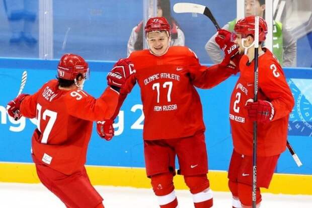 После драматической победы российской хоккейной сборной в финале Олимпийских игр со счетом 4:3, «Красная машина» и болельщики, вопреки запретам гимна РФ Международным олимпийским комитетом (МОК), исполнили национальный гимн России, заглушив нейтральный олимпийский, который был включен на церемонии награждения.